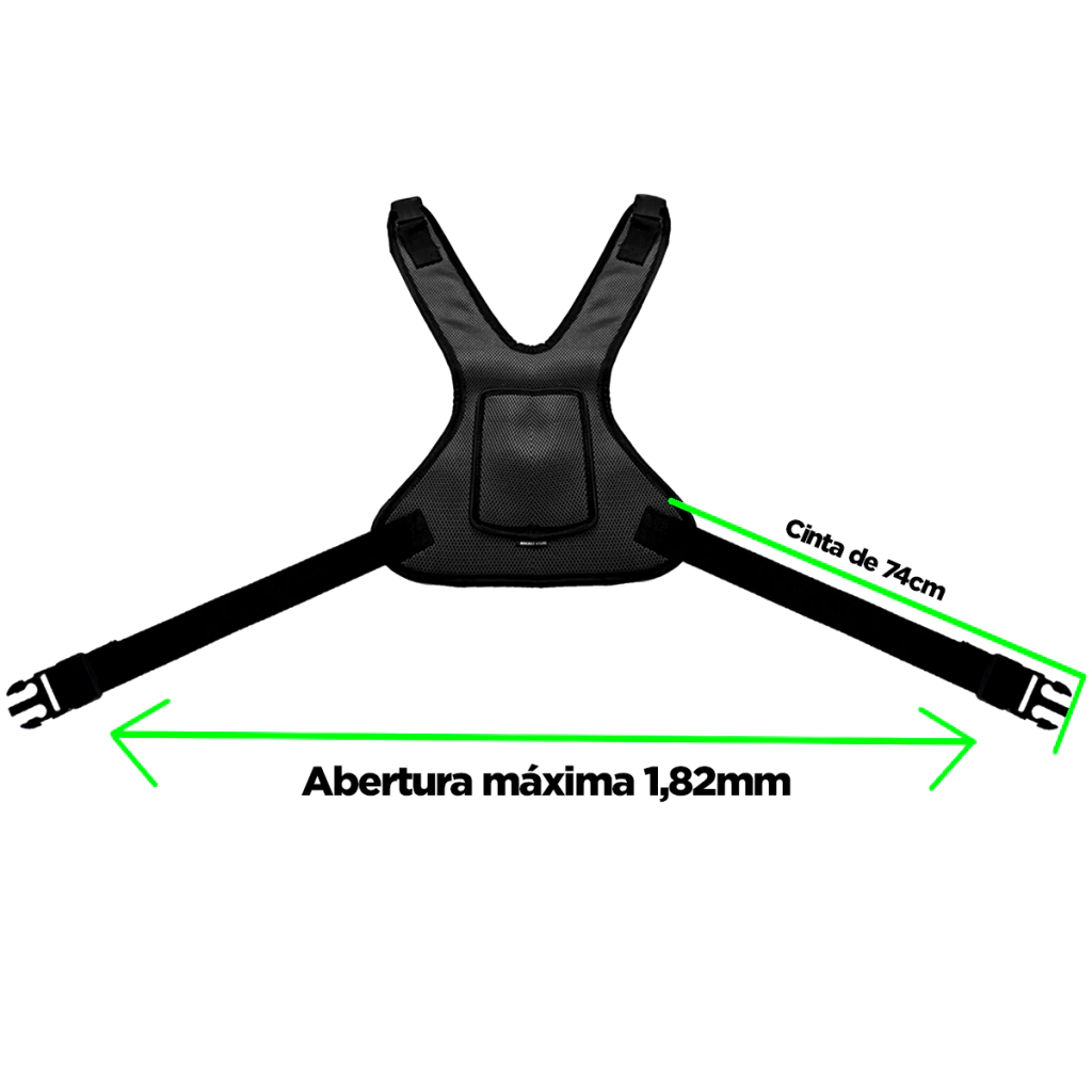Fácil de prender com duas fivelas de engate em cada lado, o peitoral do cinto é acolchoado para maior conforto. Suas alças ajustáveis chegam ao comprimento máximo de 182 centímetros.