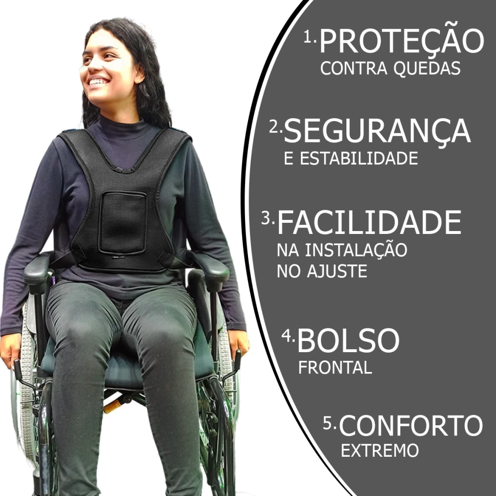O cinto de segurança torácico, traz mais segurança e estabilidade no momento do uso da cadeira de rodas, impedindo que o tronco do paciente se incline tanto para frente, quanto para os lados.